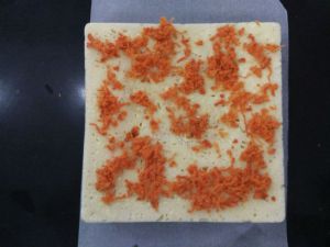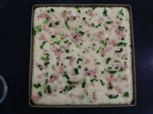 倒出反翻面放在油纸上,涂上沙拉酱,再放上肉松。