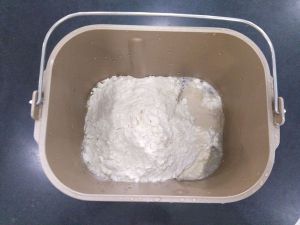 将主料的水、糖、盐、奶粉、黃油、鸡蛋、高筋面粉、酵母放在面包桶,用面包机和面功能30分钟。
