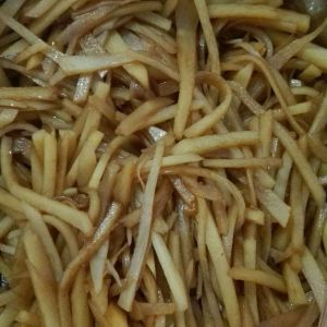 捞出土豆丝,倒入酱汁内搅拌,最后完成了
