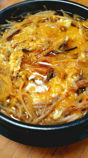 大葱洗净后切成段,和豆芽菜,煮牛肉用的香菇一起下入牛肉汤中煮,煮开之后放入之前调好的酱,加盐调味,因为要泡饭吃,所以可以咸一点