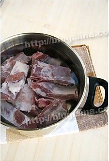 排骨冷水下锅,水沸后撇去浮沫,捞出排骨;