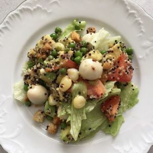 所有食材倒入大盘,面包块最后放,软了就不好吃了。没拌匀,放橄榄油,盐,我还加了油醋