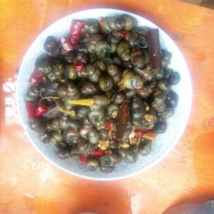 加入田螺,鸡粉,盐(盐是平时炒菜三倍用量 ),加适量水。大火煮八分钟。