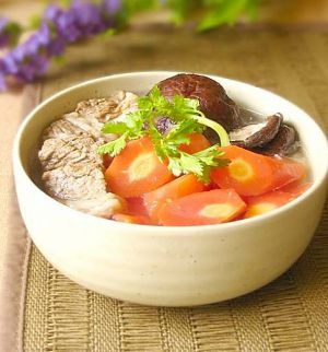 二小时后放入切好的胡萝卜与香菇一起煲半小时即可出锅了,出锅时在碗内放盐,点缀上香菜即可食用