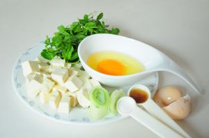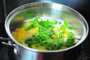蛋片凝固后,关火,放入适量的盐及豆苗。