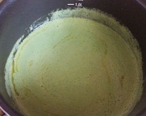 将锅烧热,倒入黄油融化,倒入青豆泥和白糖,逐次加入淡奶油,煮至沸腾起泡即可。