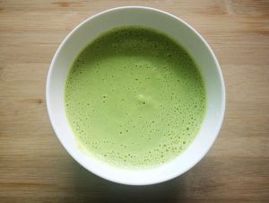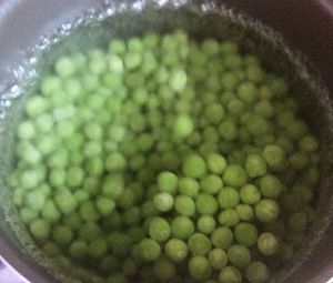 将煮熟的青豆和牛奶一起倒入榨汁机中搅打成青豆泥。