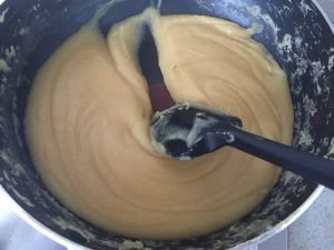 一直不断的翻炒,防止糊底。炒至锅铲从中间划过,豌豆糊不会立即合拢。