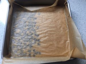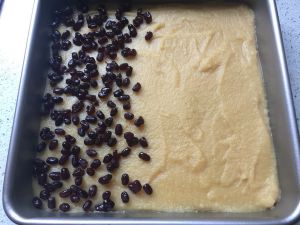 将豌豆糊装入方形烤盘,尽量抹平表面。其中一半放了一层蜜红豆。