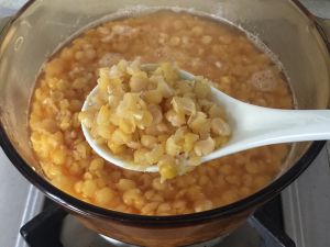小火慢煮至豌豆全部开花。大约20分钟到半小时左右。小火煮时注意锅盖不能盖严实,防止溢锅。