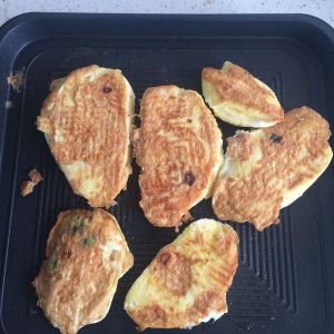电饼铛预热好了,把蘸过鸡蛋液的馒头片放在锅内,静等