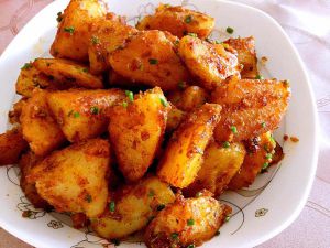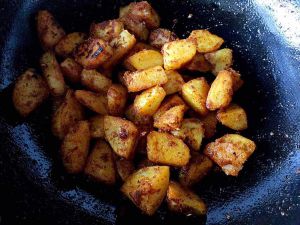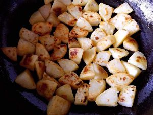 锅内放入少许芝麻油(我们家的芝麻油是外公自己种的芝麻榨出的油)将煮熟的土豆放入锅中,中小火煎