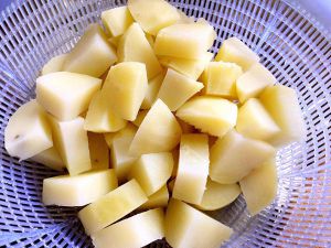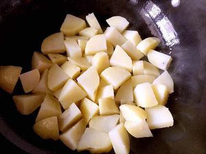 把土豆削皮,切块入锅煮熟,煮土豆时放点盐进去,容易让土豆入味