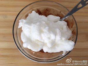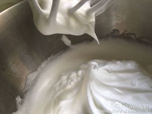 蛋白加白砂糖打发至湿性发泡,即提起打蛋头蛋白拉出弯曲的尖角