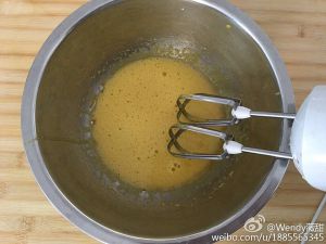 将蛋白蛋黄分开,蛋黄加白砂糖用打蛋器打发到体积膨大浓稠。