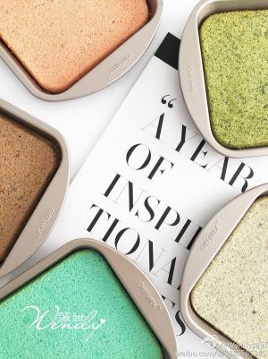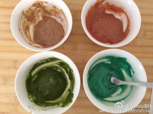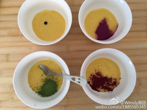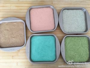 蛋黄糊分成5份,分别加入可可粉、紫薯粉、红曲粉、抹茶粉、色素(漏拍一份)