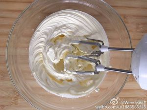 准备裱花奶油。淡奶油加糖粉打发至有纹路。