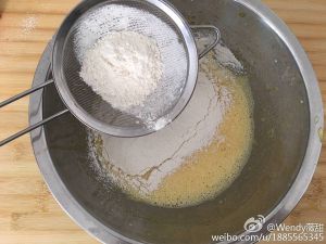 低筋粉和泡打粉混合筛入蛋黄糊,用硅胶刀混合。