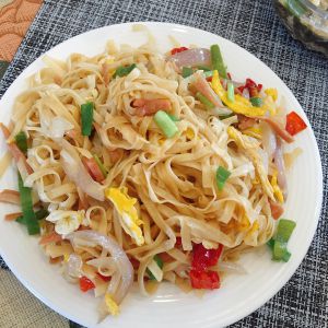 把鸡蛋在热油里炒碎 青椒丝 火腿丝 洋葱丝 干辣椒一起放下翻炒一分钟 加入沥干水的面条 再立马加入生抽 醋 盐 翻炒5分钟