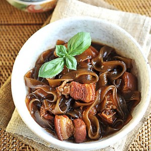 五花肉切成约3cm大的方块。红薯粉条提前一天用温水泡软备用。