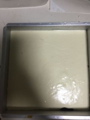 然后再放上另一层戚风再将剩余慕斯倒入,表面弄平整放入冰箱冷藏至少5-6小时。