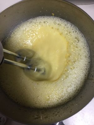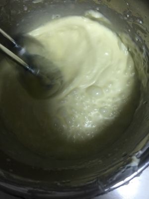 蛋黄打蛋器打发后,待汤水降温后倒入蛋黄中,边倒边搅打均匀。