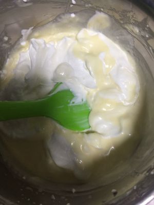 然后将融化的吉利丁片和搅打好的蛋黄液倒入马斯卡彭奶酪中搅打均匀。