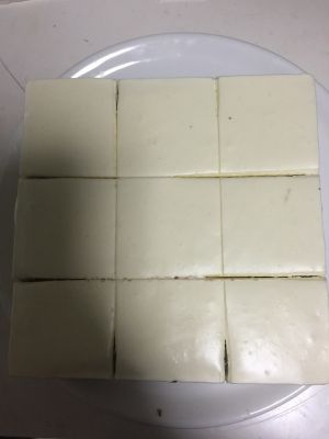 冷藏好后取出切成九分,每切一刀时将刀刃擦干净再切下一刀。