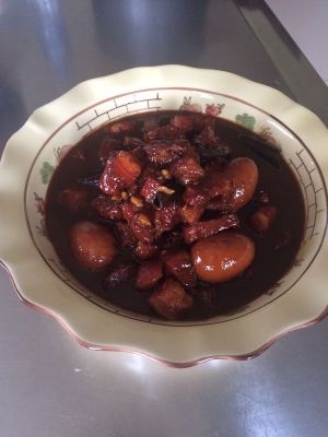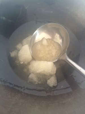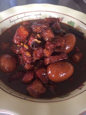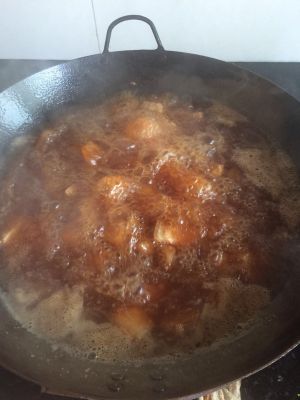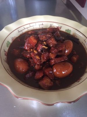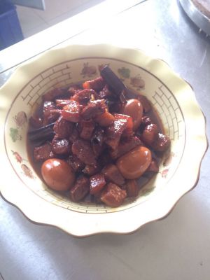 五花肉切麻将块,锅放底油煸一下加水,加黄酒,啤酒,料酒这类的都可以。料就是放少许盐,适量味精。桂皮,八角,生姜片。(各位都是高手前辈,我就没那么啰嗦发那么多细节图片。)这道红烧肉就是用糖色来上颜色不用加老抽(酱油)。自己吃放盐放味精就可以不用那么复杂,调味品放的多固然好吃但吃多了对身体不好。桂皮,八角,生姜,酒都是去腥味的。