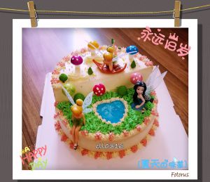 分次用牙签沾色素调成自己喜欢的颜色进行装饰裱花。蓝色湖水加一点细砂糖和色素调制好,放火上加热后倒入吉利丁粉搅均匀,放凉后再放冰箱冷藏一小时左右,最后摆上玩偶装饰就完成了。