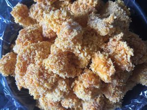 拿出昨天的胸脯肉,在碗里打一个鸡蛋,搅匀鸡蛋,肉块放入玉米淀粉盘,用手裹上面粉,用筷子把粘上淀粉的肉块放入鸡蛋液中,裹上鸡蛋,再把它放在面包糠的盘子里,让面包糠沾上肉。这是全部做好的鸡米花。