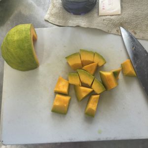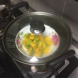 买了一个小南瓜,先用一半的量。去蒂削皮,皮一定削干净,不然会影响后面蒸熟搅拌。