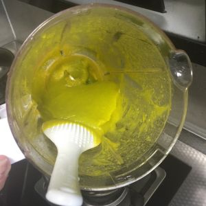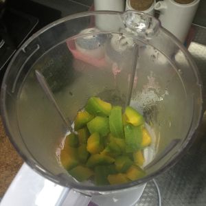 蒸好后稍微放凉后。倒入搅拌机内,可以适当加一点点水,切记不要过多,否则就不是南瓜糊,而是南瓜汁了。搅拌打碎,成糊状即可