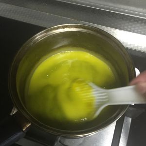 将南瓜糊倒入小锅,开小火,分三次加入糯米水,有一点需要记住,糯米粉会沉淀,建议倒入时稍微搅拌一下。中间加几粒冰糖,增加甜味