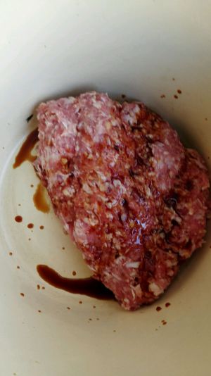 猪肉用刀剁到(如图)然后葱、姜切碎与猪肉一起继续剁。