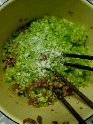 芹菜切碎简单剁一下,不要太细,剁好的芹菜,与肉馅一起,加适量花生油,盐搅拌均匀,在这里我要特别说一下,以往我包芹菜饺子都是先把猪肉馅里打一些水,剁好的芹菜挤干水,在搅拌,今天情况特殊这两步骤都省了,质量可没下降哦,还有再加入芹菜之前,肉馅里稍加点香油搅拌。