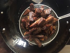 油锅烧热,稍微多点油,油温一定要高,牛肉分两次下锅炸至变色。每次炸完以后,油锅温度要高一些才能再放牛肉。