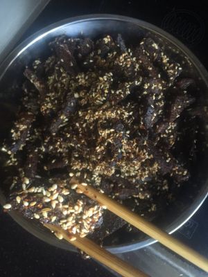 炸好的牛肉倒入佐料混合均匀放凉即可。