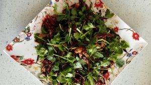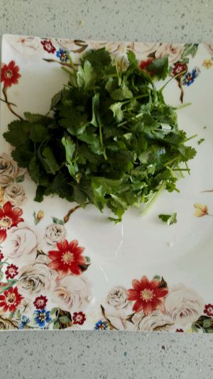 香菜洗净水控干切成一寸长小段,放在盘子里