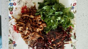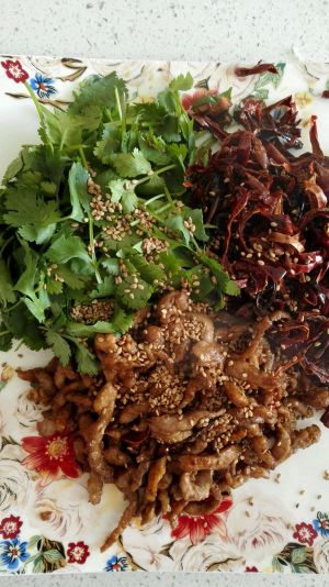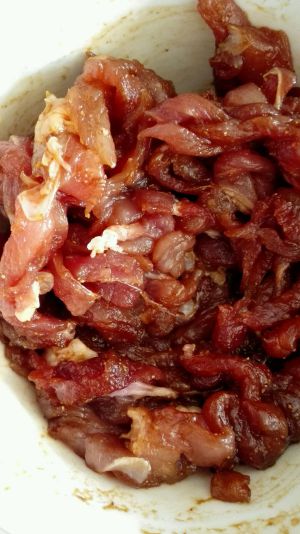把瘦肉切成细丝,用盐,料酒,十三香腌两分钟