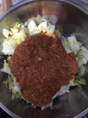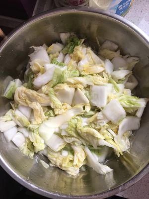 挑选一颗新鲜白菜,把外表老叶去除洗净后,切块(其实也可以不切,白菜中间一刀,一切为二,我怕吃的时候麻烦,所以提前切块);均匀撒上盐,腌制一晚上,第二天变塌的状态,把水挤干,待用。