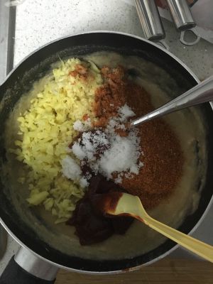 待糯米粉晾凉后,加入姜末、蒜末、辣椒面、新松辣酱、一点点糖(也可不加)、盐适量(依据个人),搅匀。