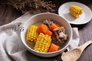 排骨洗净,胡萝卜去皮、玉米洗净,切块。