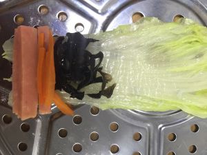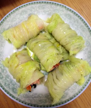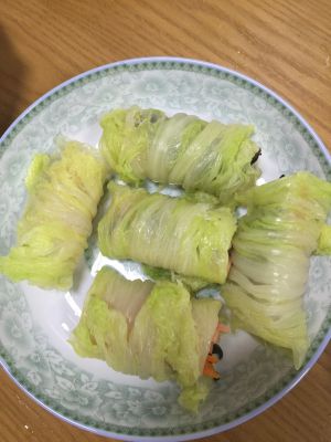 将胡萝卜丝木耳丝鸡蛋丝火腿条放在白菜叶上卷成卷。