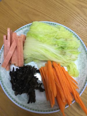 鸡蛋摊成饼切丝,胡萝卜切丝,木耳切丝,火腿切丝,将胡萝卜丝木耳丝放入开水中烫熟。(鸡蛋,火腿什么的根据自己口味自行添加)