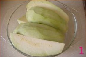 将茄子削皮洗净,放入微波炉专用钵里。