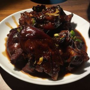 3.放油,热锅,很热那种。把配料,葱段、姜片、八角、桂皮、陈皮、香叶、干辣椒、花椒等爆炒。放若干冰糖,熬化。下猪脚翻炒上色。放生抽、少量红烧酱油、继续上色。加水没过猪脚,先大火,后小火慢炖。我炖了40min,感觉时间再长点会更好,怕麻烦的话,你用高压锅。