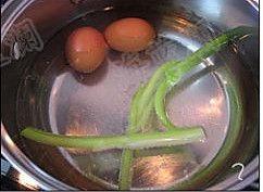 鸡蛋冷水入锅煮,水开后5分钟即可。煮鸡蛋的水开始时,可焯烫芹菜。