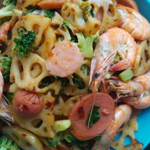 先放莲藕,西兰花,QQ肠翻炒,后放大虾,金针菇,香菜,翻炒大概四五分钟左右,调料均衡,就可出锅。