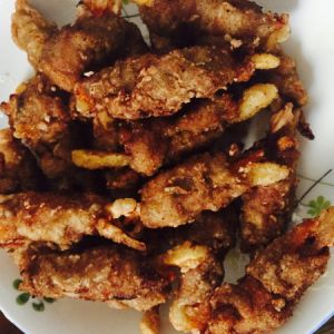 放置油锅炸至金黄,温度不要过高,时间稍微久一点,避免里脊肉内部不熟。